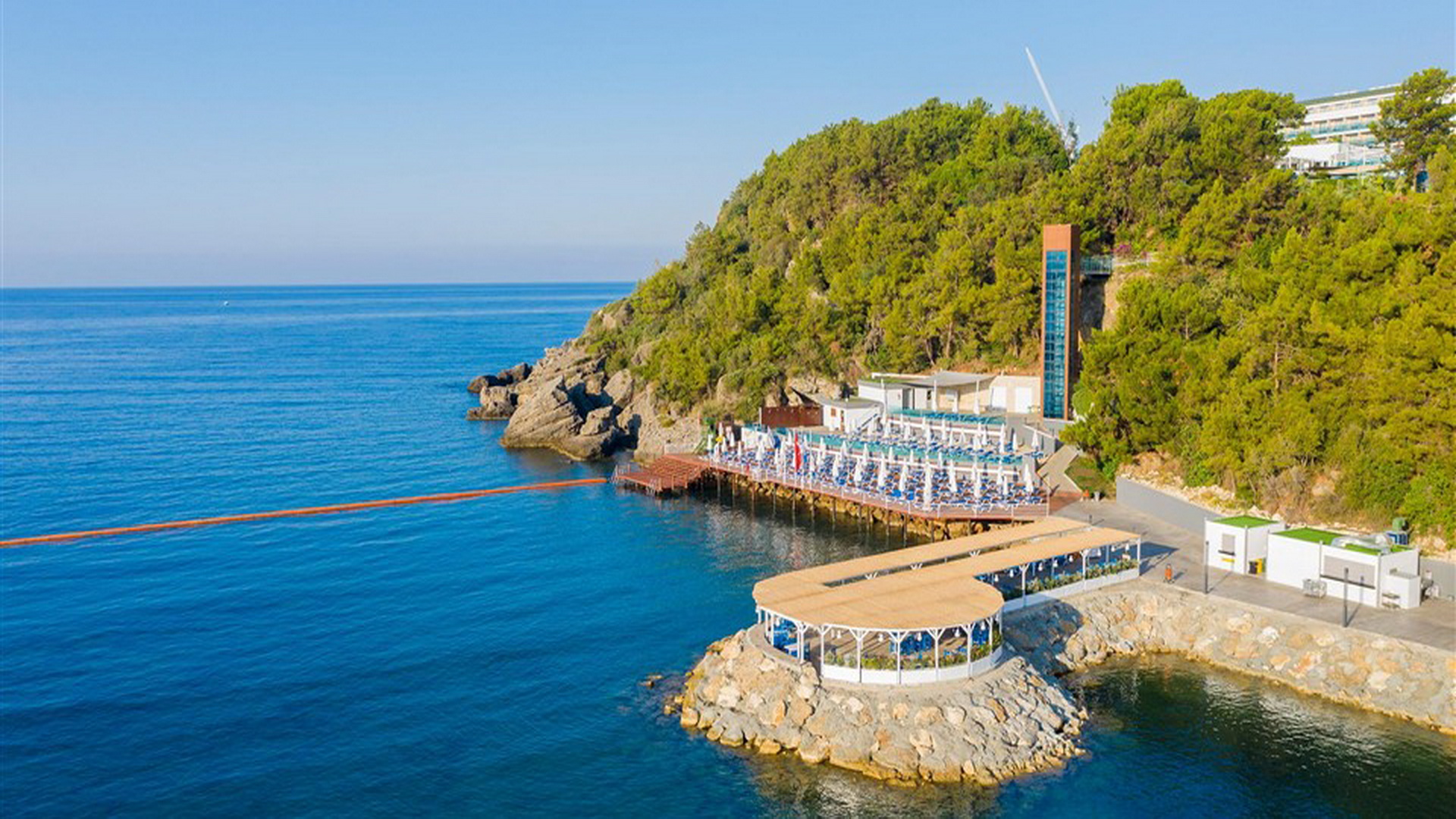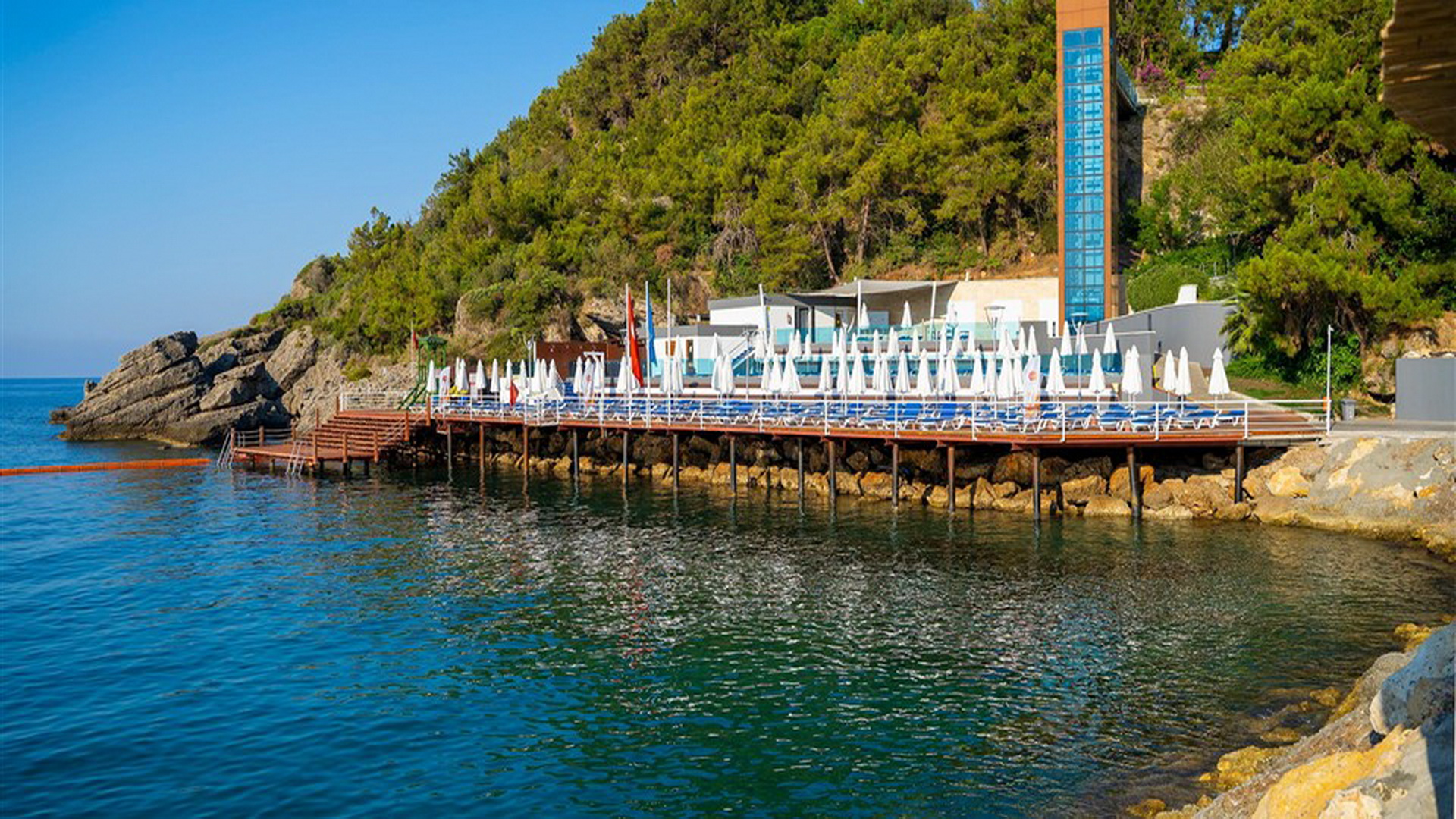 Хотелска приватна плажа составена од 3 нивоа (камчеста-карпеста плажа на прво ниво, песочна плажа на второ ниво, дрвена платформа од трето ниво) со чадори за сонце и лежалки бесплатно. Крпи за плажа – со депозит. Има лифт кој води до плажата.