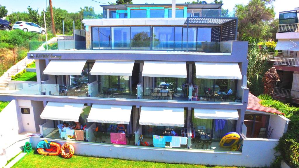 Вилата е одалечена околу 800м од центарот на Неа Модања, на околу 20-30 м.од плажа. Вилата е понова градба со уреден двор со тревна површина. Сите студија имаат тенди кои прават пријатни сенки во топлите денови.