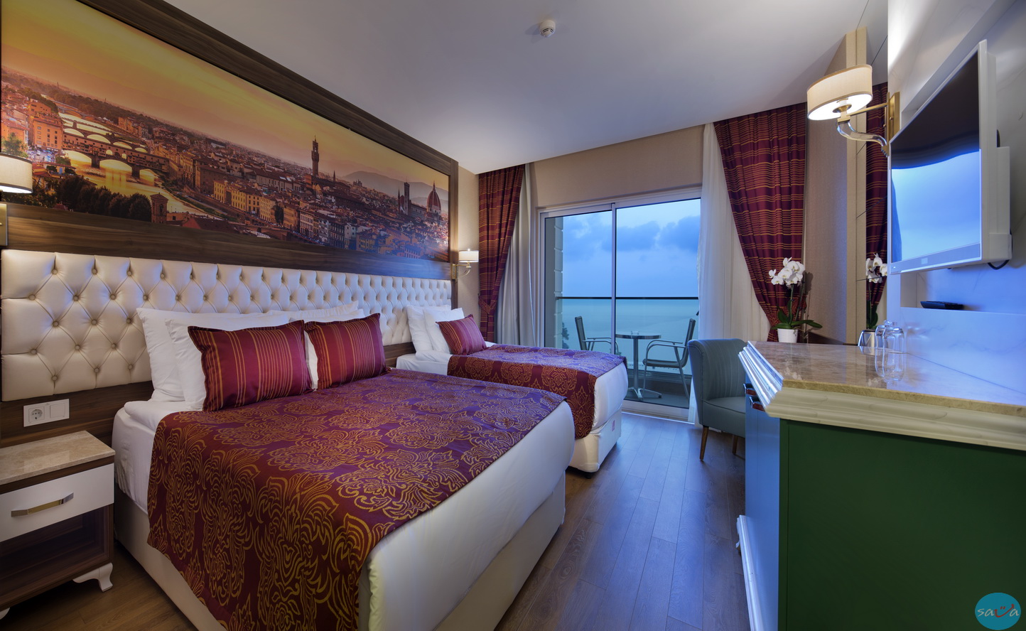 Вкупно број на соби 259. Стандардни соби (32-46 м2, 1 спална соба, 1 купатило, макс. 2+2 лица), џакузи соба (34 – 40m², 1 спална соба, 1 купатило со џакузи, макс 3 лица), Фамилијарни соби (54m², 2 спални, 1 купатило, макс 4+1 лица). Сите соби се опремени со сопствено купатило со туш кабина, фен, централна клима уред (работење по часови, зависи од временските услови), директна телефонска линија, мини бар (вода, безалхохолни пијалоци, пиво се дополнуваат секој ден), електричен бокал, кафе и чај, сеф, сателитска ТВ и музички канали, балкон, WI-FI интернет конекција со мала брзина.