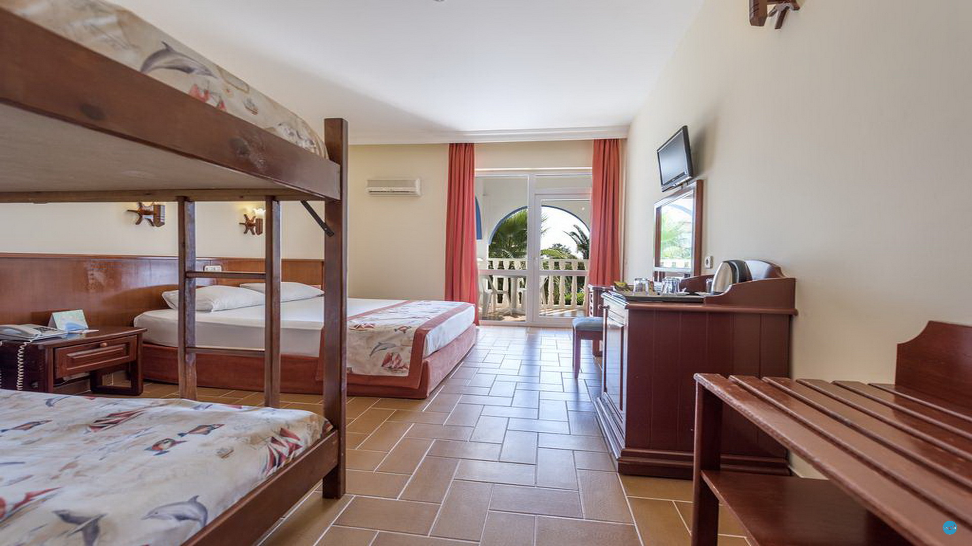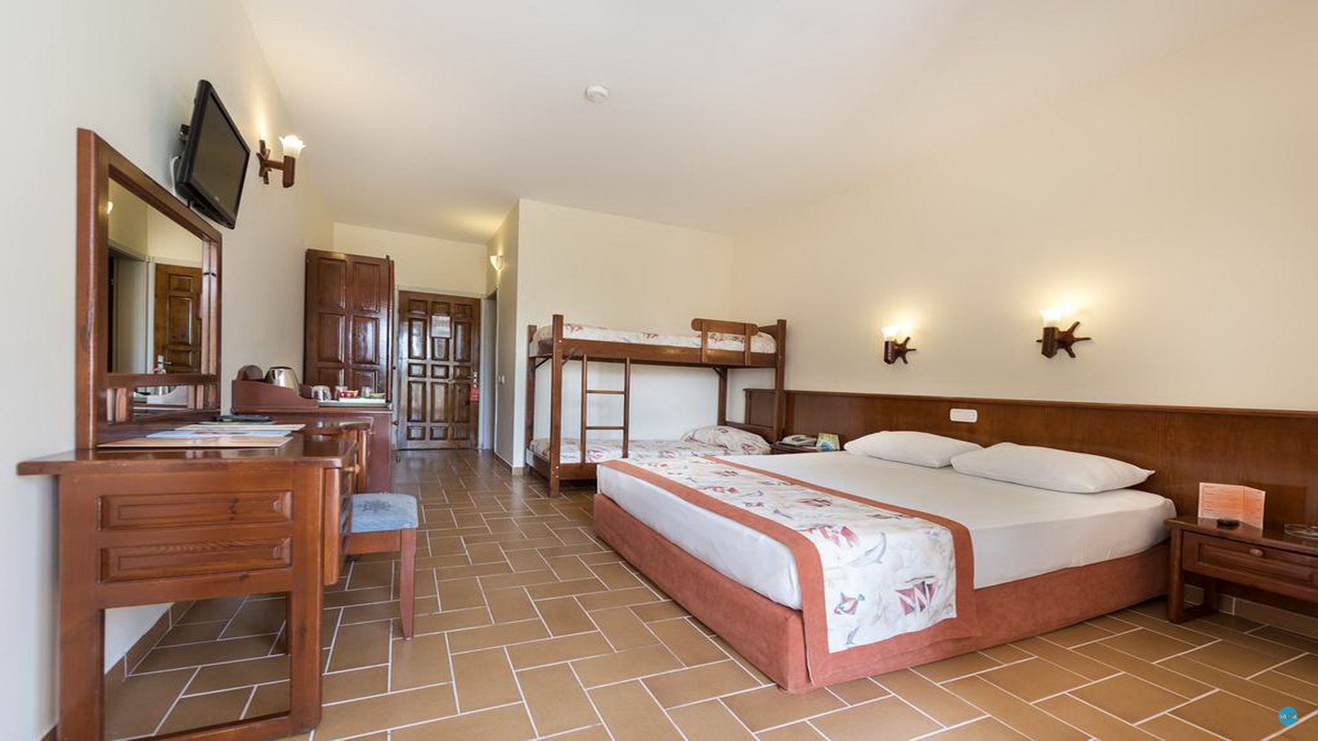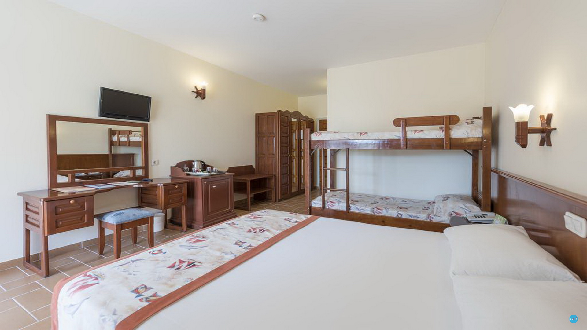 Вкупен број на соби 296, во четири згради. Клубски стандардни соби 214 (22м², една спална, едно купатило, макс.2+1 лица), Клубски фамилијарни соби 63 (25м², една голема соба со кревети на спрат, макс.2+2 лица), Суит фамилијарни соби 16 (50м², една спална, една дневна, едно купатило, макс.5 лица). Сите соби се со балкон или тераса, со поглед на море или градина, купатило со туш, фен, клима сплит систем, телефон, плочки на подот, мини бар (секој ден се сополнува со вода), сет за кафе и чај, сеф (се наплаќа), сателитска ТВ и музички канали.