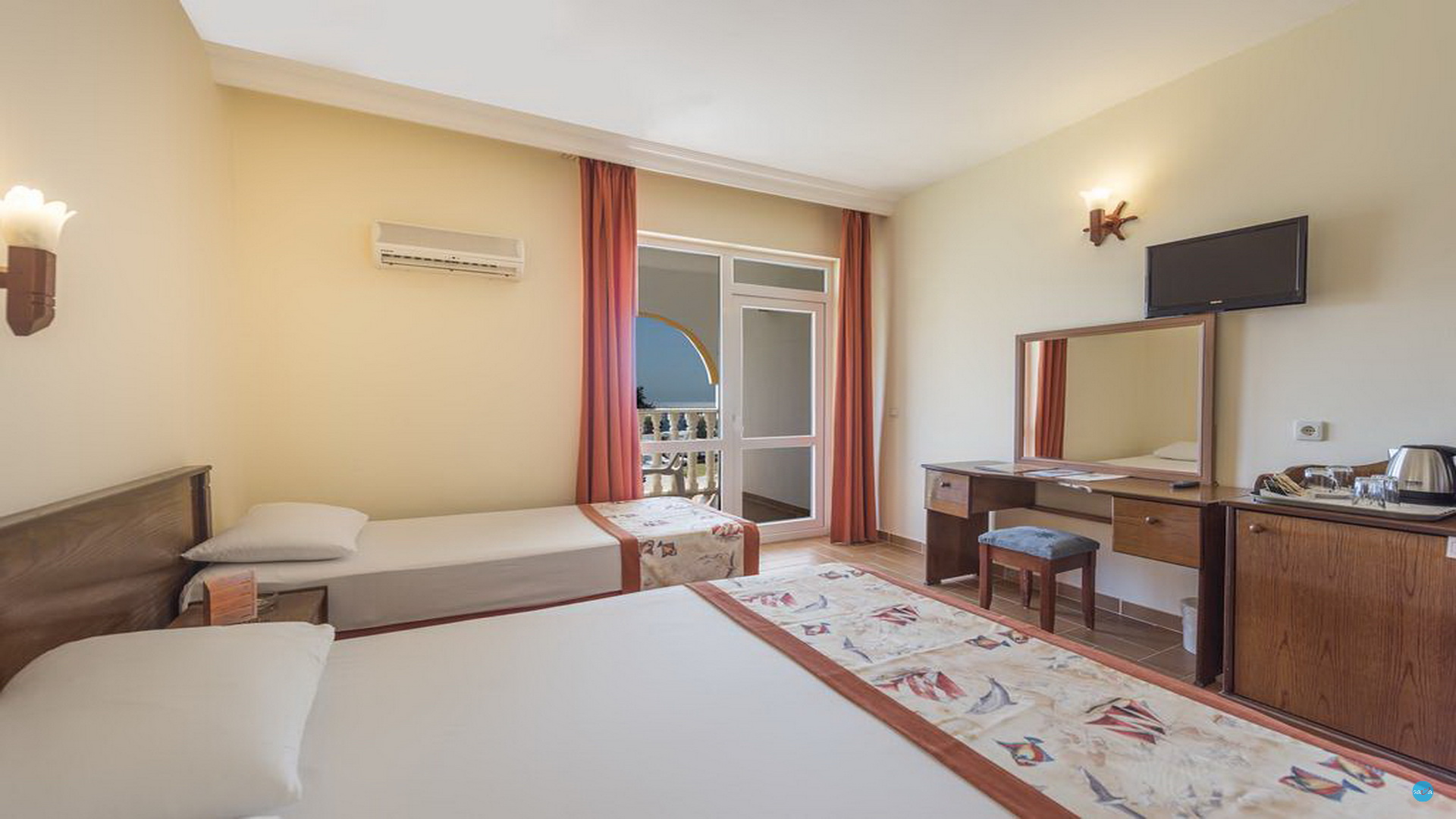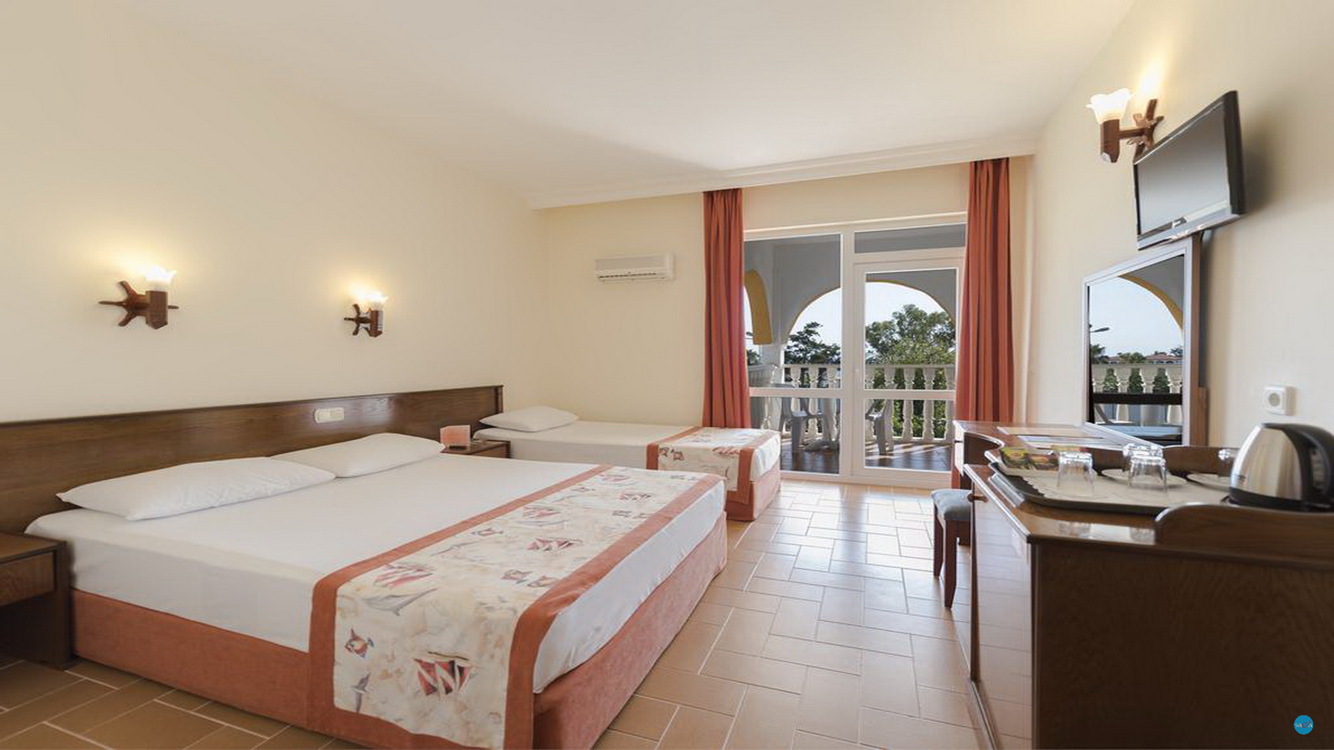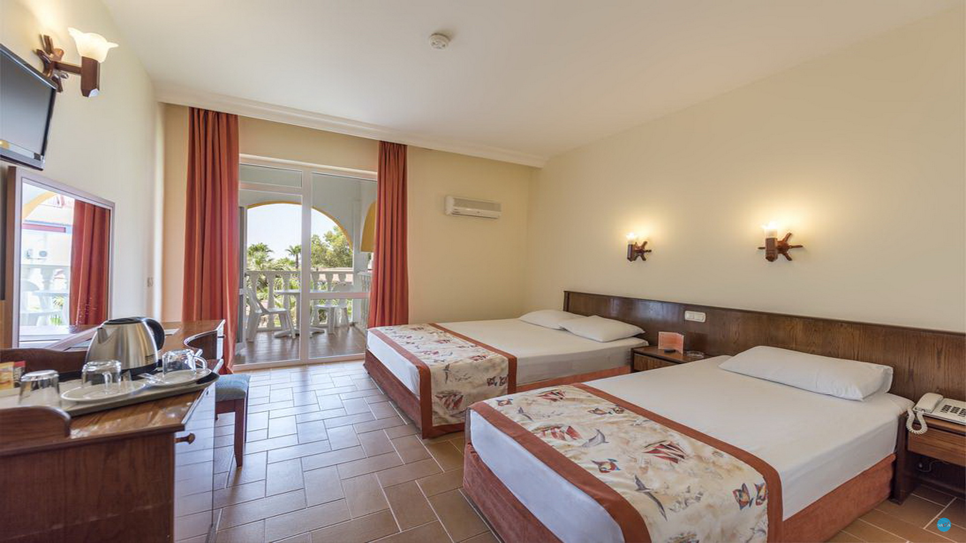 Вкупен број на соби 296, во четири згради. Клубски стандардни соби 214 (22м², една спална, едно купатило, макс.2+1 лица), Клубски фамилијарни соби 63 (25м², една голема соба со кревети на спрат, макс.2+2 лица), Суит фамилијарни соби 16 (50м², една спална, една дневна, едно купатило, макс.5 лица). Сите соби се со балкон или тераса, со поглед на море или градина, купатило со туш, фен, клима сплит систем, телефон, плочки на подот, мини бар (секој ден се сополнува со вода), сет за кафе и чај, сеф (се наплаќа), сателитска ТВ и музички канали.