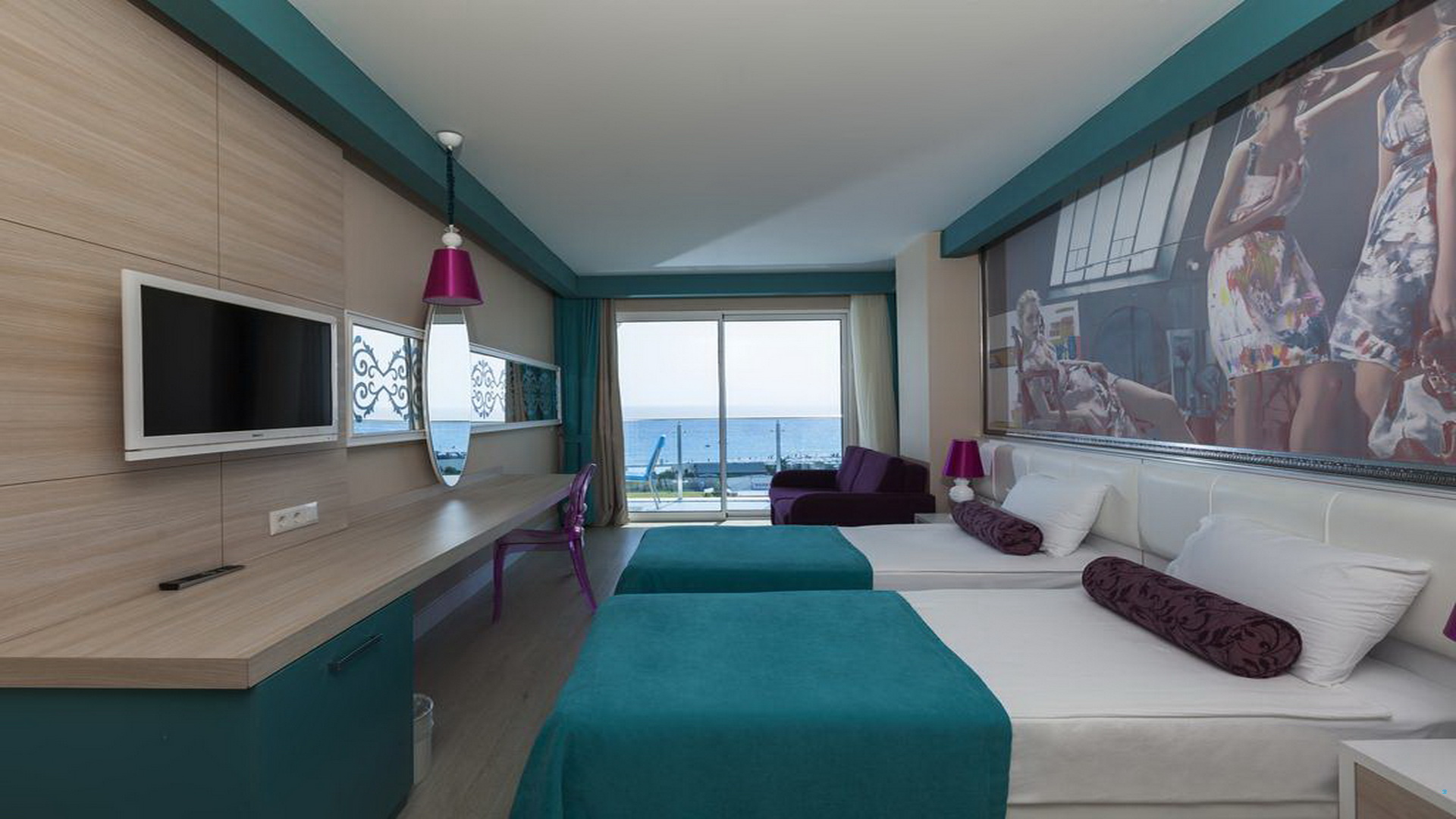 Вкупен број на соби 347. Стандардни соби (32m², една спална соба, едно купатило, макс.2+1лице), Фамилијарни соби (55m², две спални соби со врата помеѓу, едно купатило, макс.4+1 лице) и 4 соби за лица со хедикеп. Сите соби се со приватно купатило со када и фен, централен клима уред кој работи според временските услови, телефон, мини бар (се дополнува со вода и минерална вода секој ден ), сеф (се доплаќа), ламинатен под, сателитска телевизија и музички канали, балкон.