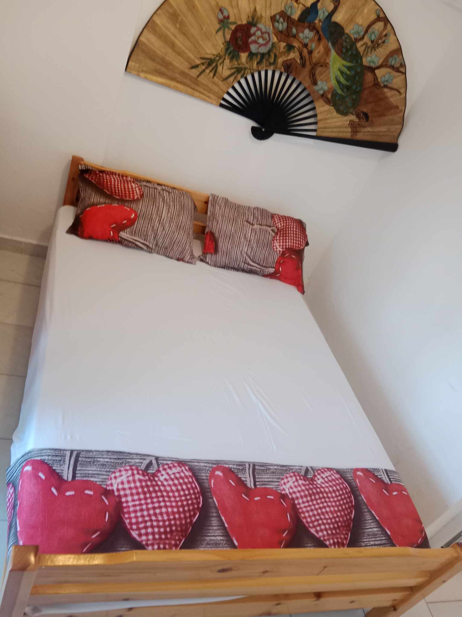 Во едната соба има еден брачен кревет. Во дневната два дупли кревети на развлекување.Дневната и кујната се споени. Кујната е опремена со основен прибор за подготовка на лесна храна. Има голема тераса. Апартманот се наоша на приземје или полусутерен со 3 скали надоле.