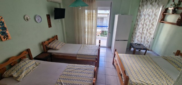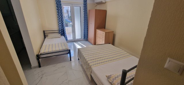 Апартманот има соба со брачен кревет,еден единечен и во другата соба една фотеља на спуштање (наменета за дете до 11.99год.)