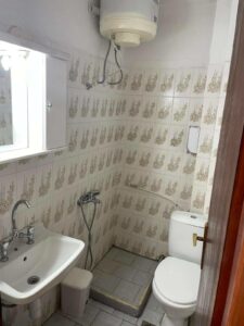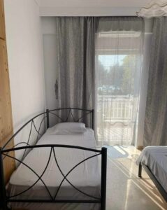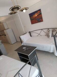 Апартман Хрисанти 06 во Флогита. За 4 лица, на само 30 метри од плажата. Се наоѓа на полусутерен, но е сосема нов. Две спални соби, едната со брачен кревет, а другата со 1 единечен, но широк кревет. Може да се сместат 2 мали деца. Можност за еден дополнителен кревет на расклопување. Кујна опремена за подготовка и сервирање храна и пица. Апартманот има машина за перење алишта. Климатизацијата и Wi-Fi се вклучени во цената.