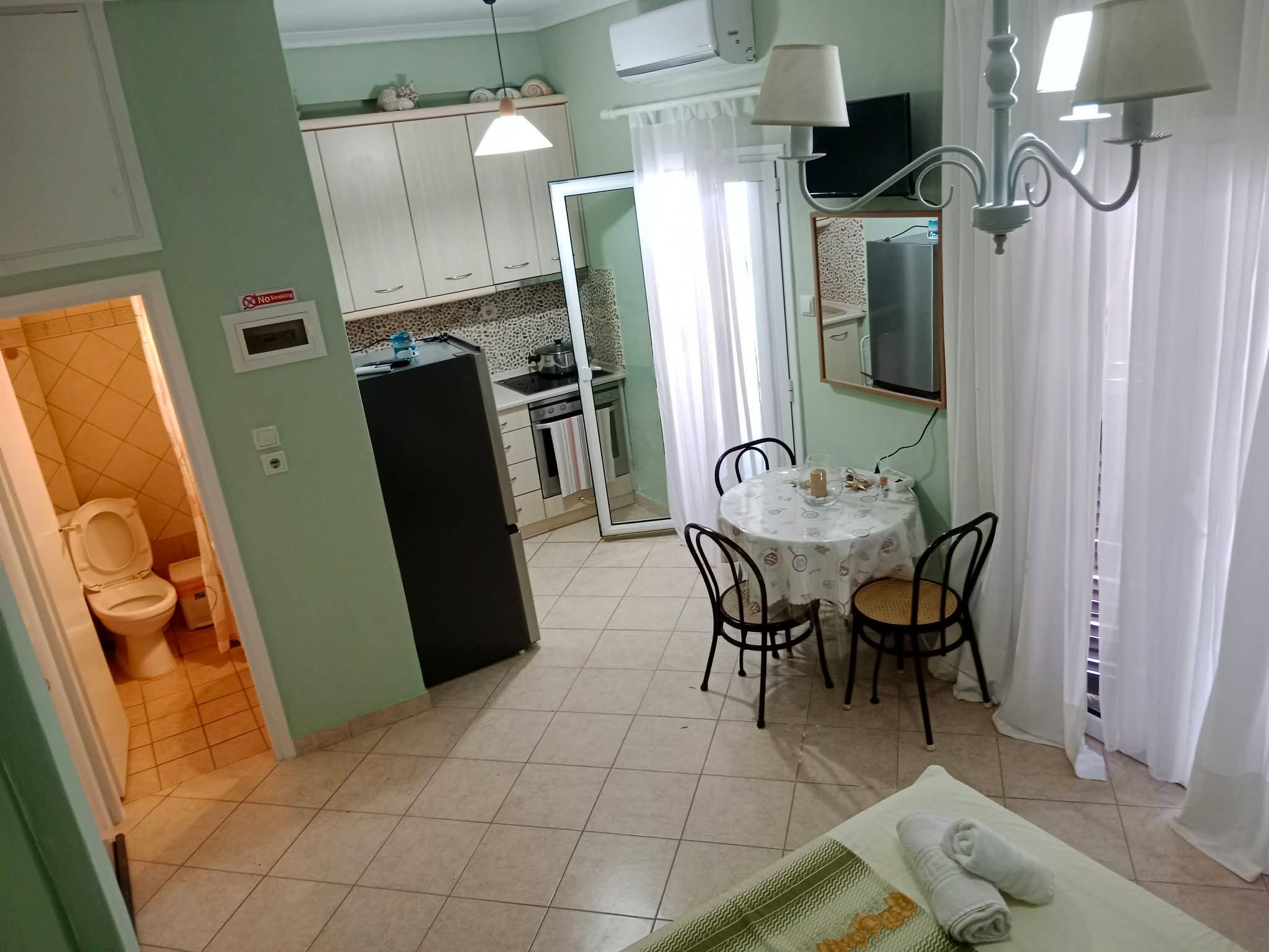 Апартман бр.1 во Неа Плагија. За 4 лица. 80 метри од плажата. Имате еден брачен кревет во едната соба, плус 2 единечни кревети во другата соба. Кујна опремена за подготовка и сервирање храна и пијалоци. Клима уредот и Wifi се вклучени во цената. Апартманот се наоѓа на првиот кат и има 2 тераси. Една напред и една позади.Апартман бр.2 е наменет за 4-5 лица на 80 метри од плажа. Има еден брачен кревет во едната соба, плус една софа кревет во другата соба. Можност за еден дополнителен кревет. Опремена кујна за приготвување и послужување храна и пица. Клима и Wi-Fi се вклучени во цената. Станот се наоѓа на прв кат и има голема тераса напред и мала тераса назад.