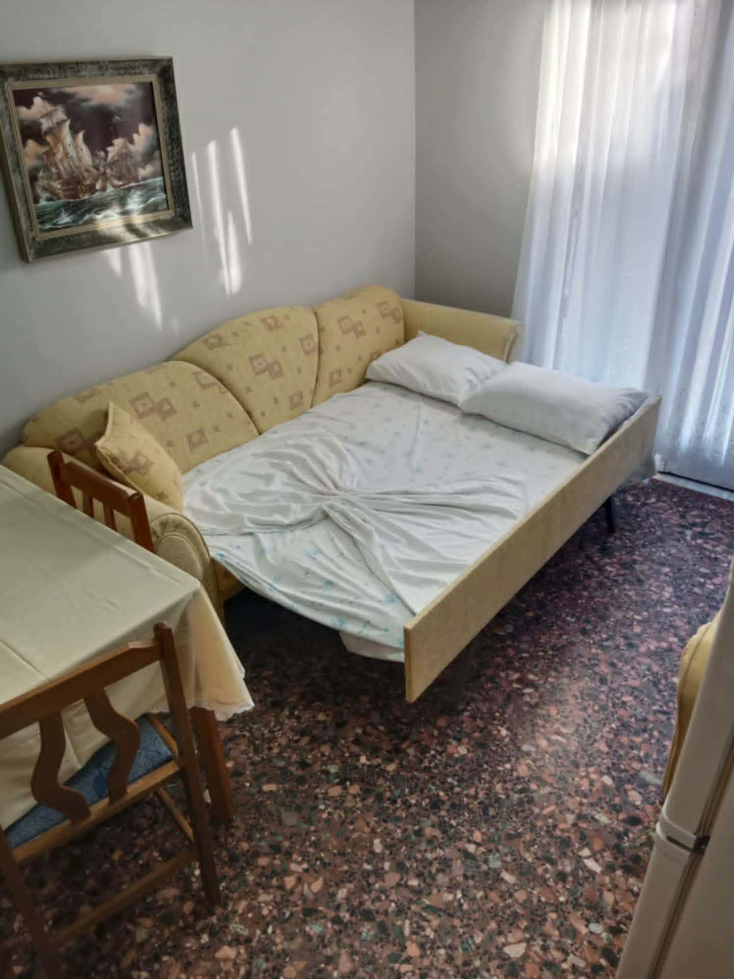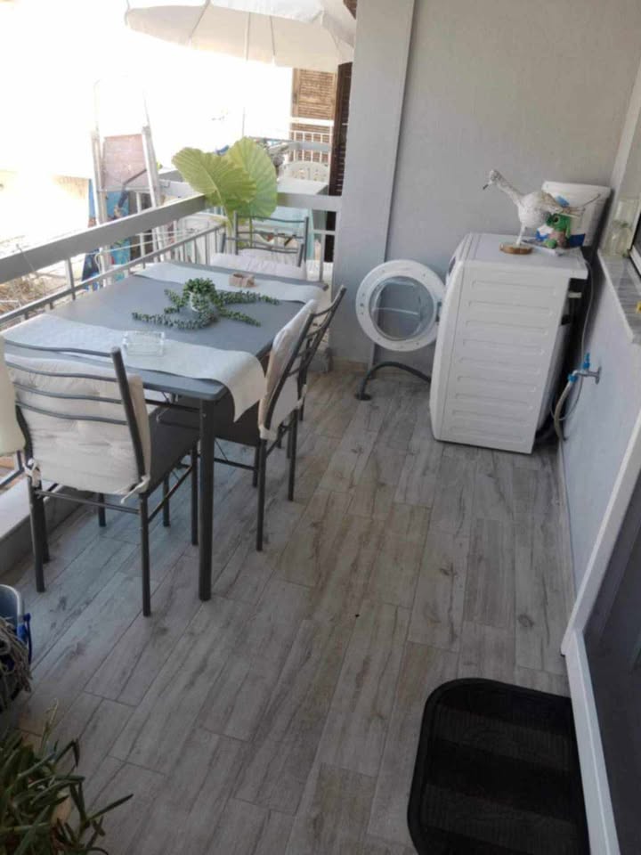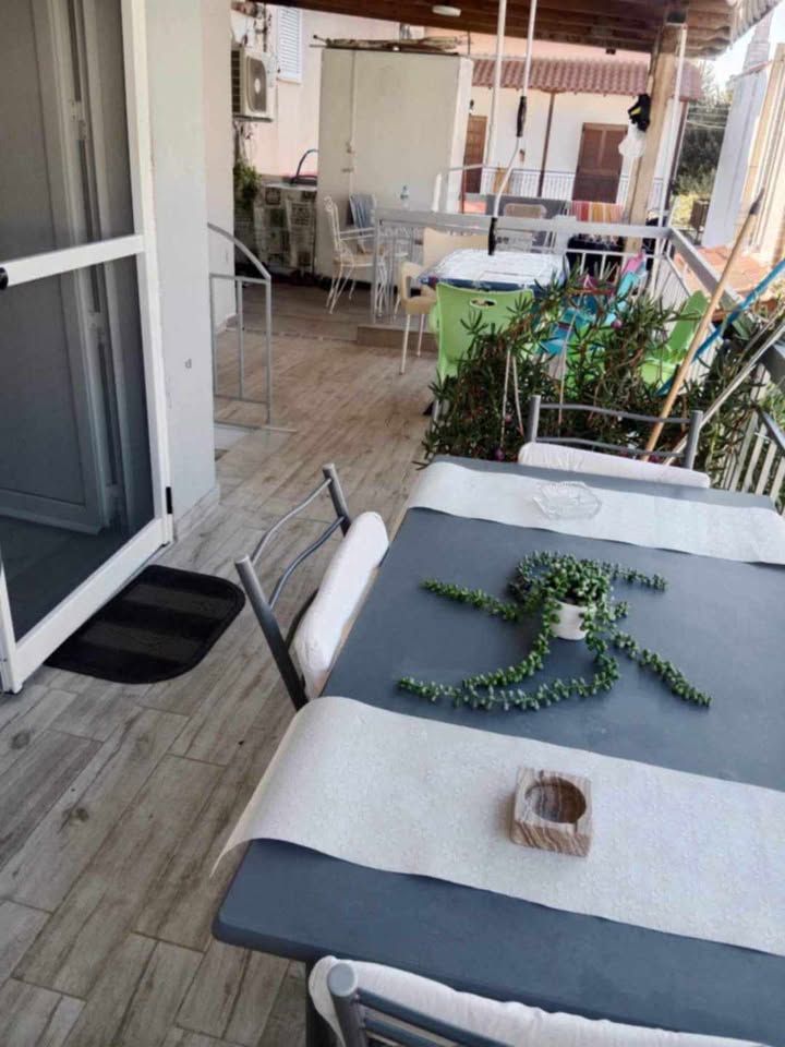 За 4-5 лица. 80 метри од плажа. Има еден брачен кревет во едната соба, плус една софа во другата соба. Можност за еден дополнителен  кревет на спуштање . Опремена кујна за приготвување и послужување храна и пица. Клима и Wi-Fi се вклучени во цената. Станот се наоѓа на прв кат и има голема тераса напред и мала тераса позади.