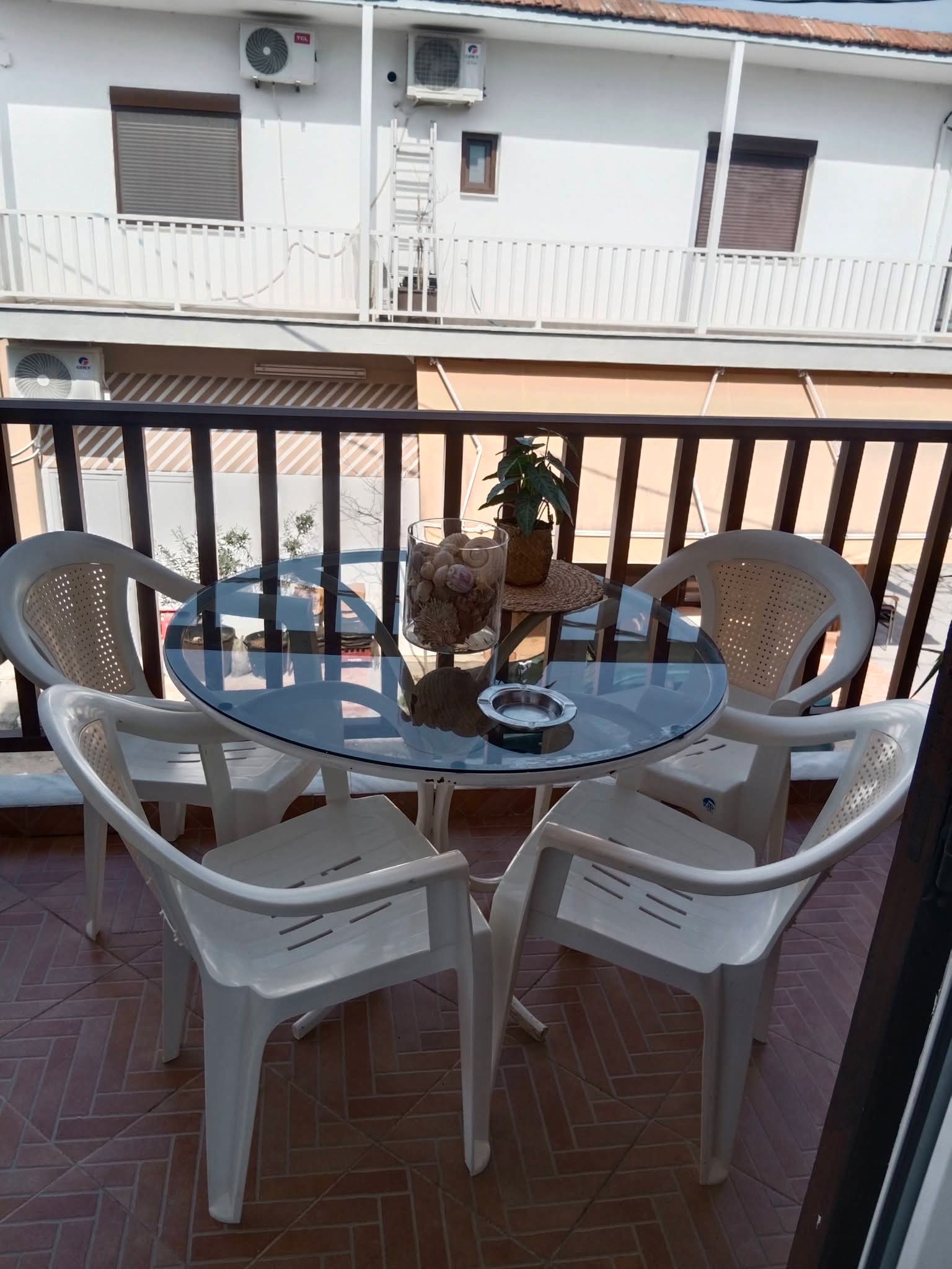 За 4-5 лица. 80 метри од плажа. Има еден брачен кревет во едната соба, плус една софа во другата соба. Можност за еден дополнителен кревет на спуштање . Опремена кујна за приготвување и послужување храна и пица. Клима и Wi-Fi се вклучени во цената. Станот се наоѓа на прв кат и има голема тераса напред и мала тераса позади.