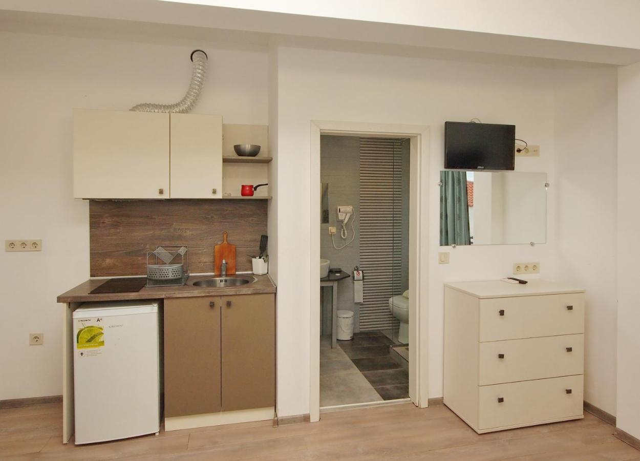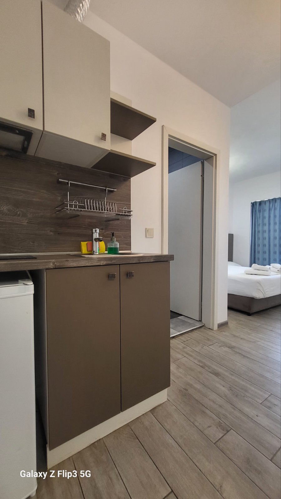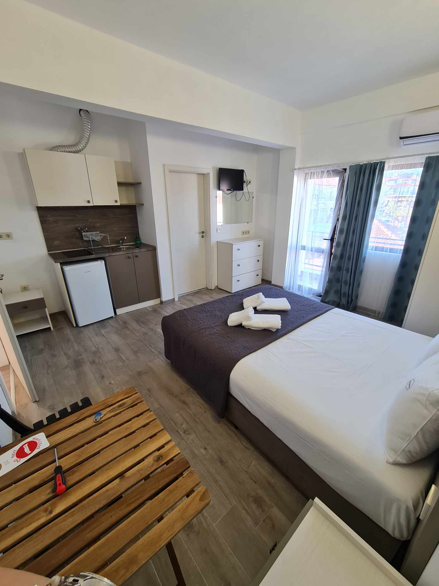 Студио број 1 е опремено со еден брачен кревет, мини кујна, тоалет и клима,за престој на максимум 2 возрасни лица.