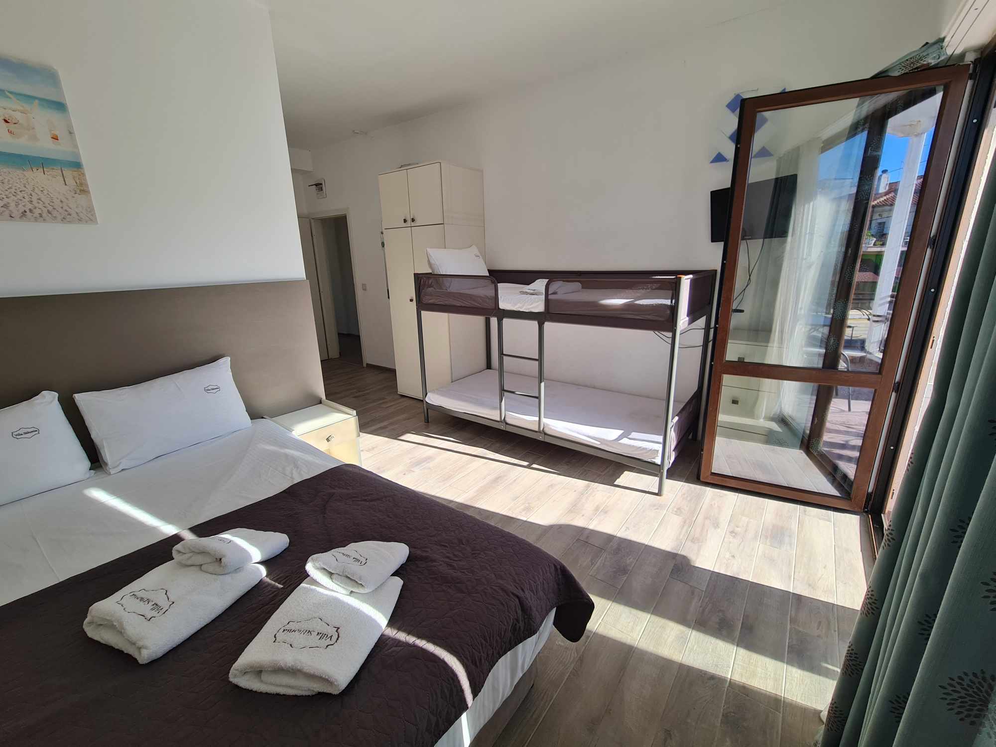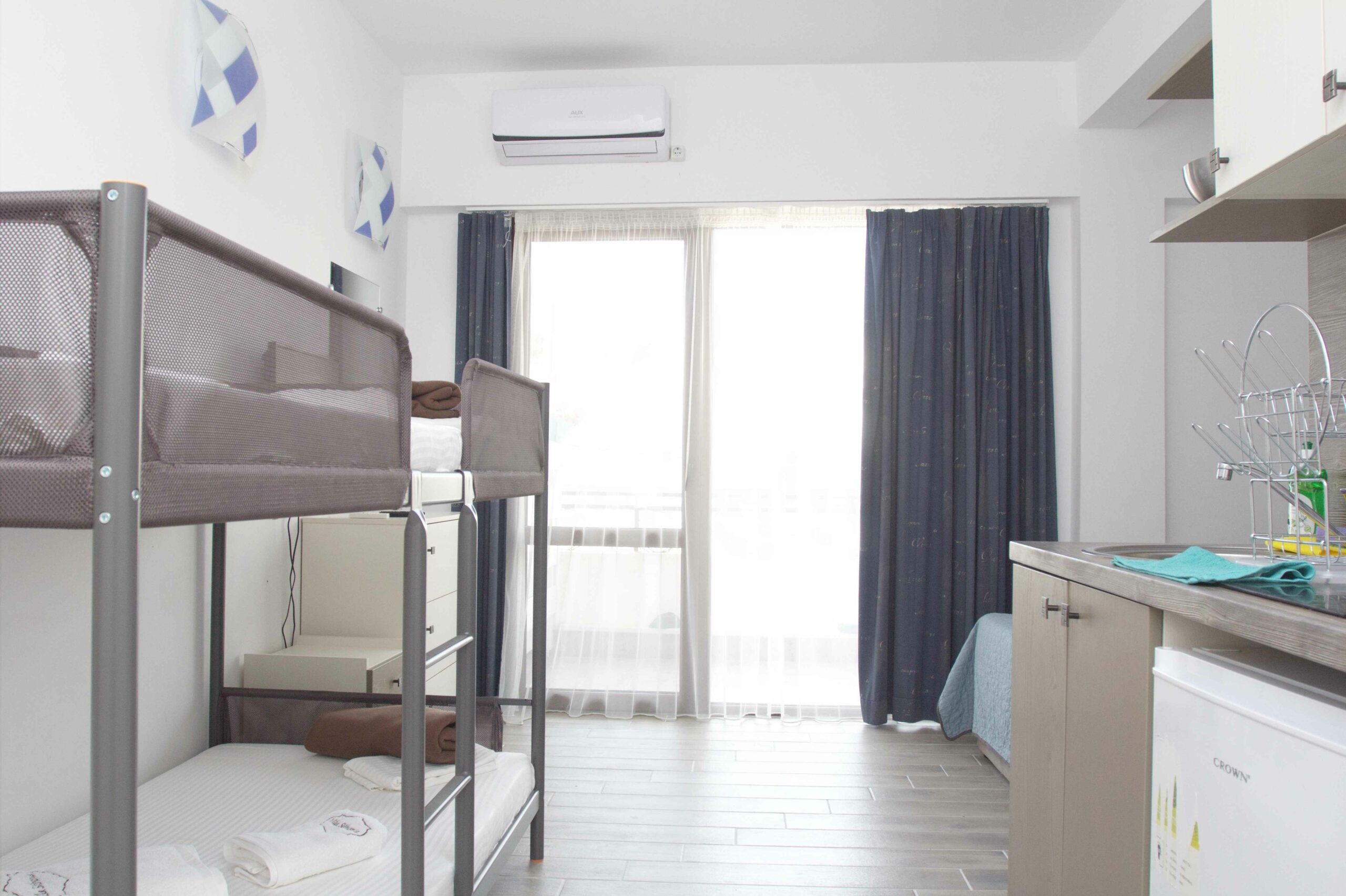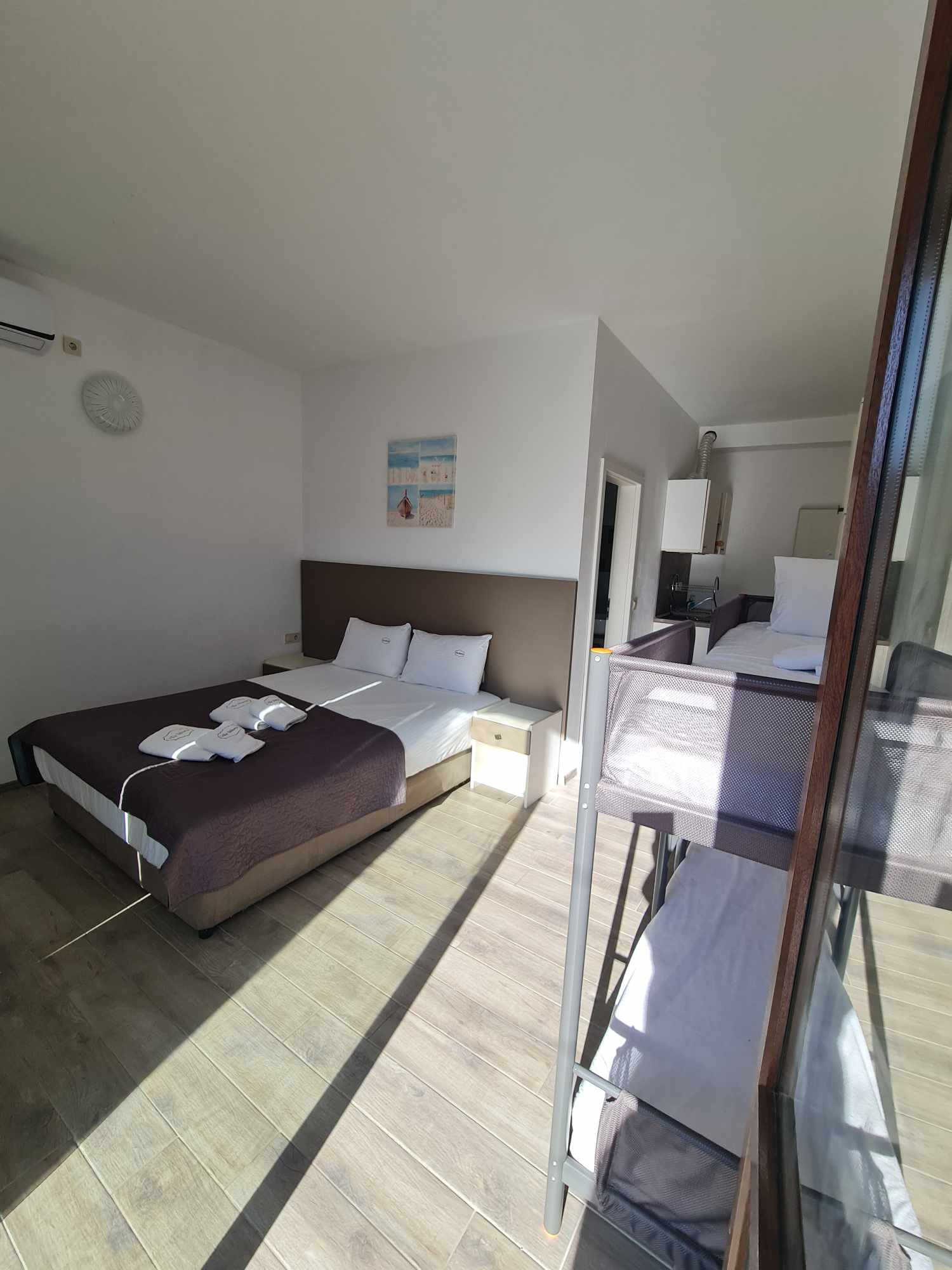 Студио број 5 е опремено со еден брачен кревет и два кревети на спрат, мини кујна, тоалет и клима.